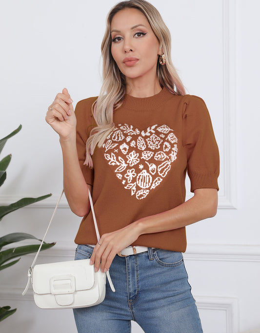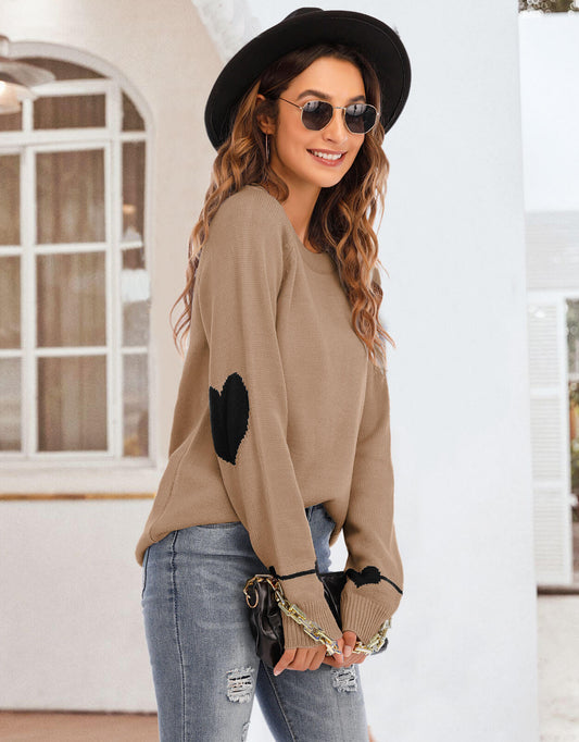 Cute Heart Lattern Sleeve Crew Neck Knit Pullover Top