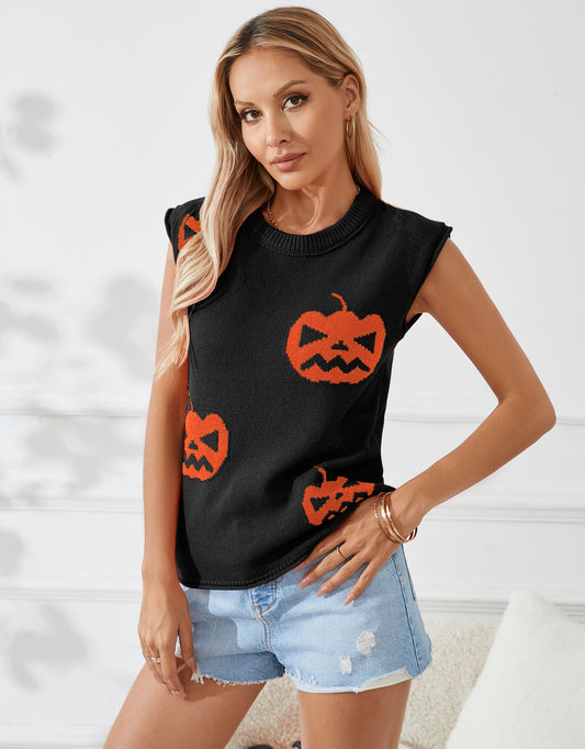 Halloween Sleeveless Round Neck Pumpkin Sweater