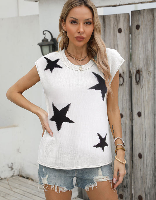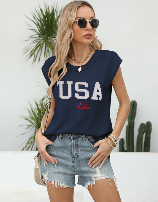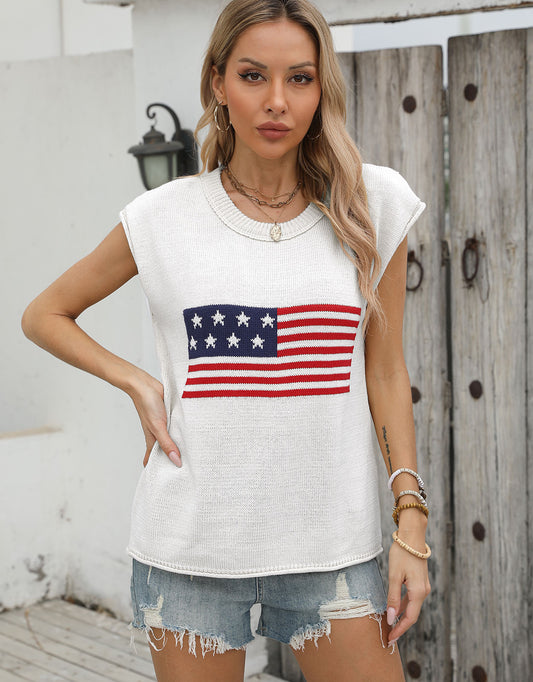 American Flag Star Loose Short Sleeve Round Neck Sweater