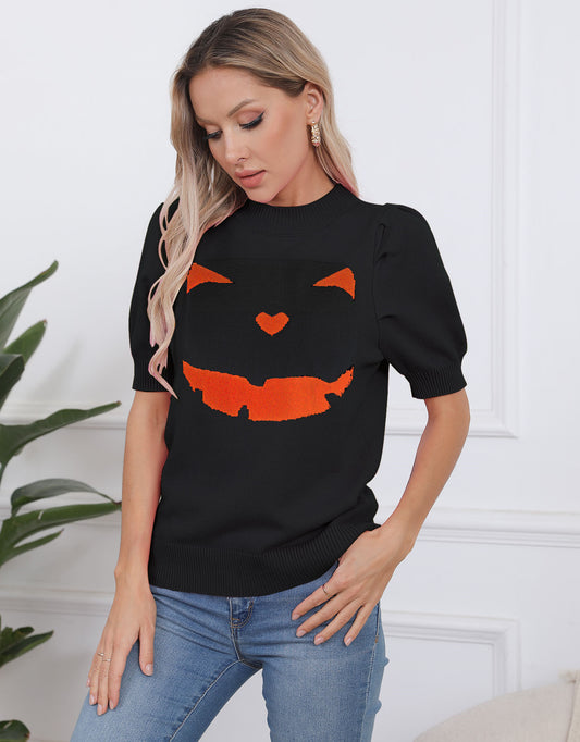 Halloween Pumpkin Smiley Short Sleeve Sweater