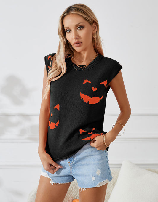 Halloween Pumpkin Smiley Sleeveless Round Neck Sweater