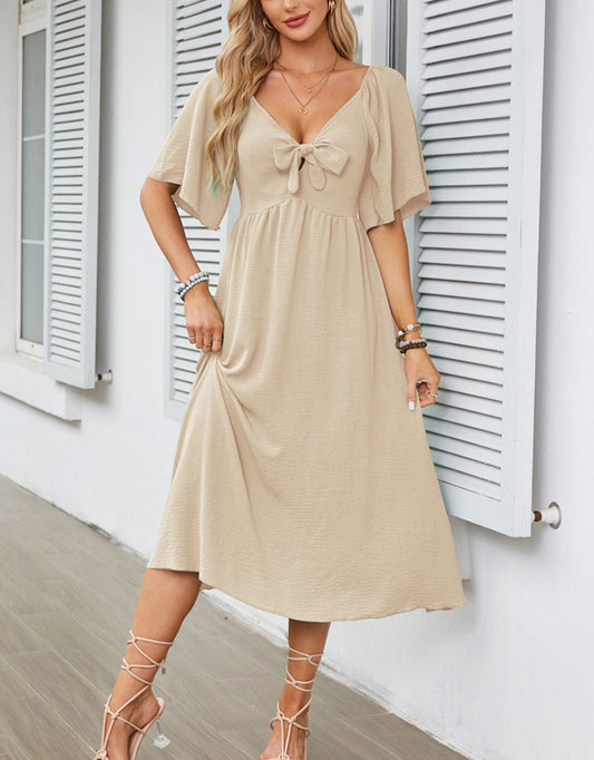V Neck Ruffle Sleeve Elegant Bow Tie Long Dress